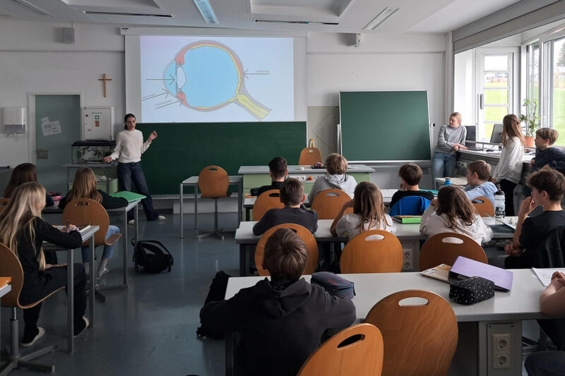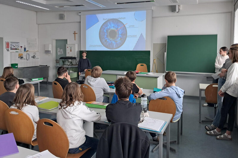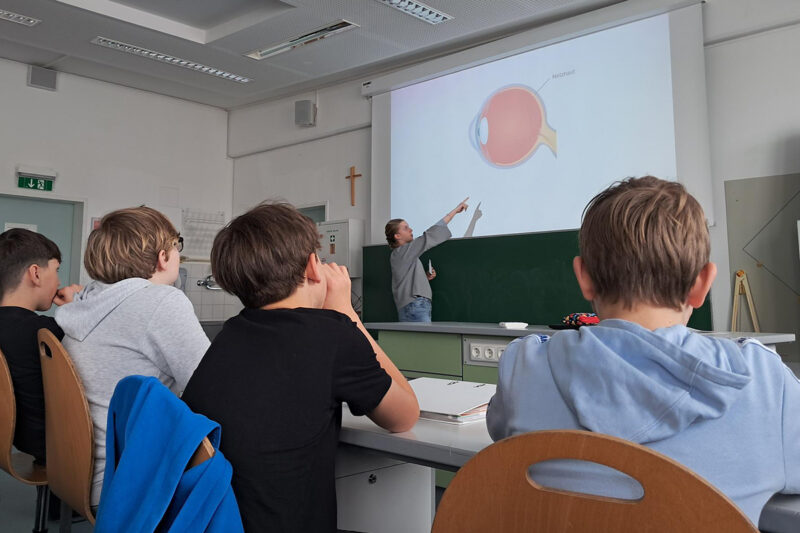 Mithilfe animierter PowerPoint-Folien veranschaulichten sie den Aufbau des Linsenauges sowie den Weg des Lichts – von der Lichtquelle über das Auge bis hin zur Verarbeitung im Gehirn. Auch die Anpassungsfähigkeit des Auges an Helligkeit und Dunkelheit sowie an nahe und entfernte Objekte wurde verständlich dargestellt.